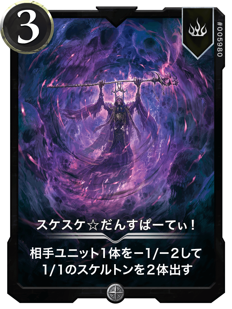 相手ユニット1体を−1/−2して1/1のスケルトンを2体出す