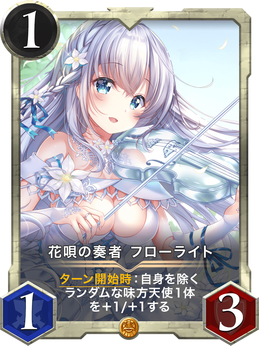 ターン開始時:自身を除くランダムな味方天使1体を+1/+1する